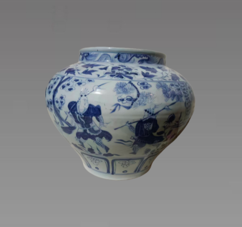 此藏品器型为典型的直口、短颈、溜肩、鼓腹、圈足制式,饱满雄浑,契合元代 “大气适配陈设” 的审美风格;胎质选用景德镇 “麻仓土”,胎体厚重坚致,露胎处可见 “火石红” 与 “糯米胎” 特征;青花以进口 “苏麻离青” 料绘制,发色浓艳幽蓝且釉面带自然 “铁锈斑”,是元代进口料青花的标志性工艺特质;罐身纹饰分层布局,口沿绘卷草纹、肩颈饰缠枝花卉纹,腹部主体为鬼谷子下山的人物故事纹,人物线条刚劲流畅、神态生动,背景辅以松竹山石,整体繁密却层次清晰,体现了元代青花“墨分五色、构图宏大”的艺术特质,是元代宫廷或贵族的陈设用器。具有较高的收藏价值和文化艺术欣赏价值!