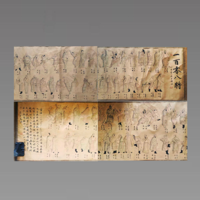 此幅为清代画家黄慎所绘水浒一百零八将古卷,画作以古朴笔墨绘就梁山一百单八将群像,人物排布规整,形神各具,线条简劲洒脱,兼具黄慎写意人物的灵动风骨与传统谱式画的谨严形制,卷中人物衣冠神态各异,辅以题字标注名号,纸色古旧苍润,整体气韵雄浑朴拙,生动再现了水浒英豪聚义梁山的飒爽英姿与豪迈气概,是兼具艺术韵味与古典题材特色的人物长卷佳作。具有较高的收藏价值和文化艺术欣赏价值!