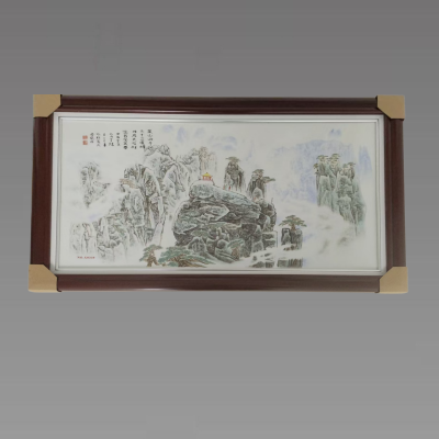 这幅瓷板画是中国工艺美术大师王锡良与其子王采联袂创作的《黄山四千仞》,也是王锡良先生的晚年遗作之一。作品以黄山奇景为蓝本,运用独创的 “青山绿水” 瓷绘技法,将雄奇险峻的峰峦、苍劲挺拔的奇松与缥缈灵动的云海凝于瓷板之上。画面层次分明,近处山石纹理苍劲,亭台楼阁点缀其间,远处群峰隐于云雾,尽显 “黄山四千仞,三十二莲峰” 的诗意与壮阔。瓷板温润晶莹的釉色与细腻工致的笔触相得益彰,既承载着中国传统山水画的意境之美,又彰显了景德镇陶瓷艺术的精湛工艺,是当代瓷绘山水的经典之作,具有较高的收藏价值和文化艺术欣赏价值!