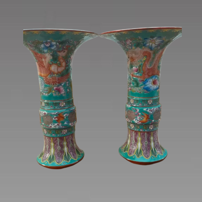 这对珐琅彩龙凤纹花觚,以松石绿釉莹润为底,集描金富丽与彩绘精绝于一身,尽显宫廷陈设的雍容气象。器型承袭商周青铜觚古制,撇口束颈,线条挺拔昂扬;龙凤纹于瓷面翩跹跃动,寓意龙凤呈祥,辅以缠枝花卉与蕉叶回纹,图必有意、意必吉祥。精工珐琅彩料层层晕染,色彩浓艳却不失雅致,描金线条熠熠生辉,见证着百年窑火的匠心传承。它不仅是中西工艺交融的艺术珍品,更凝萃了乾隆盛世的审美风骨,静立厅堂之间,便自带一室风雅与祥瑞。具有较高的收藏价值和文化艺术欣赏价值!
