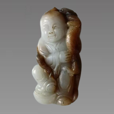 本品延续中国传统 “童子戏瑞” 经典题材,童子为民间文化中 “多子多福、人丁兴旺” 的核心象征,寄托着家族繁衍、生活顺遂的美好祈愿;所伴瑞兽既可视作龙,寓意 “童子骑龙、飞黄腾达”,祈愿仕途学业步步高升;亦可作鱼解,取 “年年有余” 之谐音,象征富贵绵长、衣食无忧。童子与瑞兽相依相伴的构图,将对生活富足、平安喜乐的向往,与对前程顺遂、家族兴旺的期许融为一体,是东方玉文化 “以玉载礼、以玉祈福” 的生动具象。