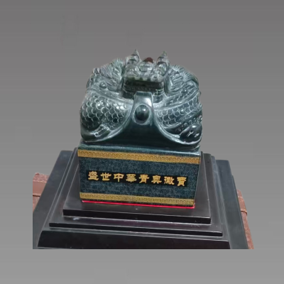 这方 “盛世中华青奥徽宝” 以中国传统玺印形制为载体,将和田青玉的温润质感与盘龙瑞兽的精湛雕刻融为一体,既延续了古代皇家宝玺 “以玉载礼、以印立信” 的文化基因,也通过描金铭文与吉祥纹样,构建起庄重典雅的东方审美体系。它以 2014 年南京青奥会为时代锚点,把奥运所代表的青春活力、开放包容精神,与中华民族 “龙跃盛世” 的文化意象巧妙交融,成为一件承载着体育盛会记忆、传播玉文化与玺印文明的当代艺术载体,在传统工艺的现代表达中,完成了东方文明与世界精神的对话,展现了中国器物 “以器载道、以物传情” 的深厚文化底蕴。具有较高的收藏价值和文化艺术欣赏价值!