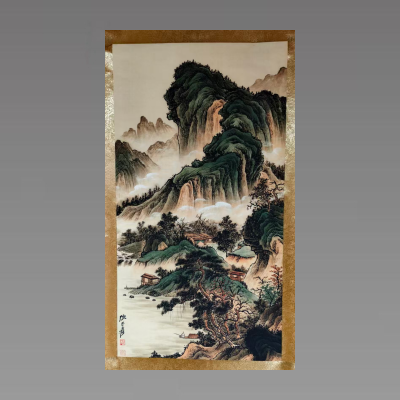 这幅作品以小青绿山水为核心面貌,尽显传统山水的雄浑与秀雅:山石先以雄健流畅的墨线勾勒轮廓,兼用披麻皴与解索皴表现岩层肌理,再以赭石铺底,层层罩染石青、石绿,墨色沉隐于浓丽矿物颜料之下,刚劲的骨线与温润的设色相得益彰,既得北派山水的巍峨气势,又具南派山水的清润意韵。云雾以留白晕染而成,轻烟漫绕山腰,将层叠峰峦分割为远近层次,营造出 “咫尺千里” 的深远空间感,虚实相生间尽显东方造境之妙。近景苍松以虬曲枯笔写枝干,松针细密劲挺,杂树则用点叶、夹叶法错落点缀,与临水茅舍、垂钓扁舟相映成趣,既显山林生机,又暗含文人隐逸的悠然意趣;整体设色典雅沉稳,浓艳而不俗,笔墨刚柔并济,既保留了传统青绿山水的庄重质感,又以灵动的云烟与生活化的景致注入了清逸旷远的东方诗意,是传统青绿山水技法的成熟呈现。