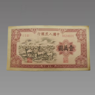第一套人民币壹万圆 “牧马图” 不仅是新中国金融史的珍贵实物见证,更承载着深厚的历史文化价值。它发行于 1951 年,是为适应内蒙古地区经济需求而发行的高面值纸币,仅流通不到 4 年就被回收销毁,存世量不足百张,成为研究建国初期边疆金融与经济恢复的重要史料;票面以细腻写实的手法描绘了蒙古族牧民驱赶马群的草原景象,既生动展现了少数民族的生产生活方式,也体现了新中国对民族文化的尊重与记录,而从右到左的书写方式更是汉字书写过渡阶段的鲜活物证。具有较高的收藏价值和文化艺术欣赏价值!
