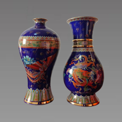 王锡良、王采款金丝珐琅《龙凤呈祥》御瓷双尊,是中国工艺美术大师王锡良从艺 90 年的艺术创新之作,也是其晚年艺术变法的代表,由他与陶瓷设计艺术大师王采联袂创作。作品以清宫经典器型凤尾尊与梅瓶为原型,双尊形制合为阴阳太极图,象征天地合美;通体以霁蓝釉为底,采用皇家金丝珐琅、描金彩绘等绝技,饰以祥云纹、帝王黄地金丝缠枝莲纹,左尊绘丹凤衔花、右尊绘祥龙戏珠,寓意 “龙凤呈祥”,既承袭清三代宫廷御瓷的雍容华贵,又融入当代艺术审美,是集皇家器型、纹饰与绝技于一身的当代陶瓷精品,具有较高的收藏价值和文化艺术欣赏价值!