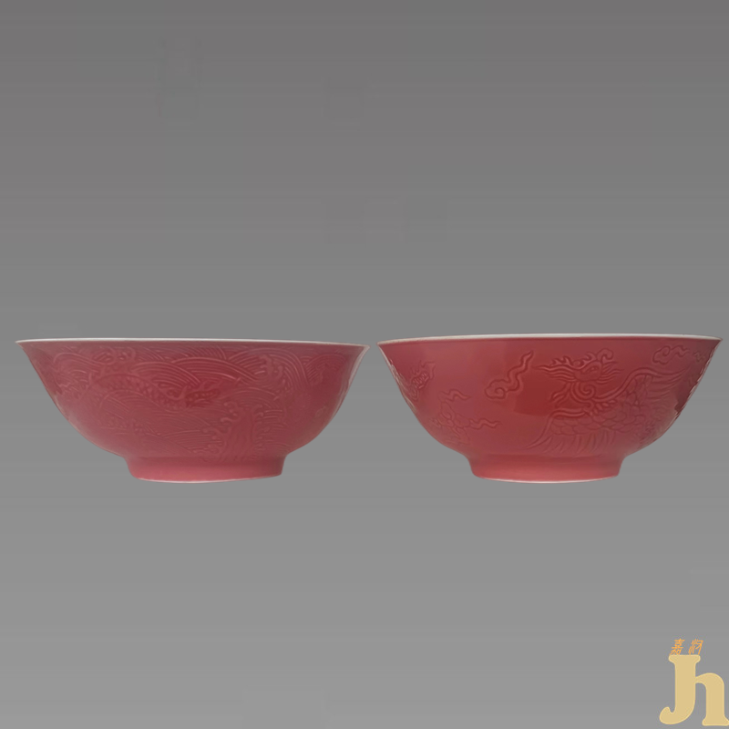 此红釉龙纹碗器底有“大明成化年御制”七字青花楷书款。撇口,深腹,圈足,器制沉稳端庄。内外通体施红釉,碗内绘有青花纹饰。总体上青花清淡典雅,外壁暗刻龙凤纹,龙身矫健凶猛,似盘旋于海天之间,与釉色自然融为一体。凤凰纹饰是象征祥瑞,凤凰齐飞,是吉祥和谐的象征。凤凰是人们心目中的瑞鸟,天下太平的象征。古人认为时逢太平盛世,便有凤凰飞来,风的甲骨文字和凤的甲骨文相同,即代表具有风的无所不在和灵性力量的意思;凰即皇字,为至高至上之意。凤能给人们带来幸福和吉祥,自然也包含了爱情的幸福。于是,凤有了象征爱情的涵义。后来就被人们用来祝贺婚姻美满,比喻夫妻和谐。祥云”则寓意着吉祥如意,顺心如意。合在一起则为升官,吉祥如意。该碗造型简洁端庄,古朴大方,釉质莹润,胎质细腻,釉色纯正,色泽沉稳,刻工精细,形象生动,工艺精细。具有很高的收藏价值和文化艺术欣赏价值!