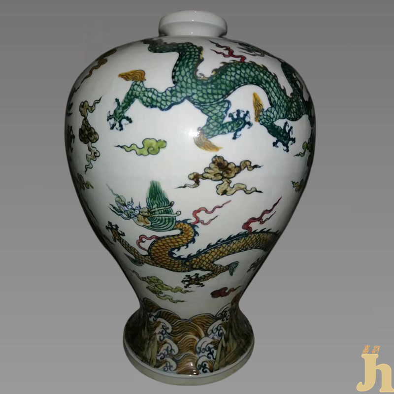 此五彩海水云龙纹梅瓶,瓶肩落“大明宣德年制”六字青花楷书款,小口、短颈、丰肩 、瘦底、圈足,自上而下渐窄,通体五彩为饰,瓶身为五彩海水云龙纹。腹部画几条五爪龙游戏于云朵间,龙作腾飞状,睁眉瞠目,炬眼炯炯,张牙舞爪,刚劲有力,龙身矫健凶猛,似盘旋于海天之间,下面是海水,上面是云,龙出水入云,水也代表财。红、绿、黄等彩穿插映衬,色釉浓艳,效果华丽。所绘龙纹栩栩如生,求其形似,颇具意蕴,不失为宣德时期五彩瓷器的上乘之作。具有很高的收藏价值和文化艺术欣赏价值!