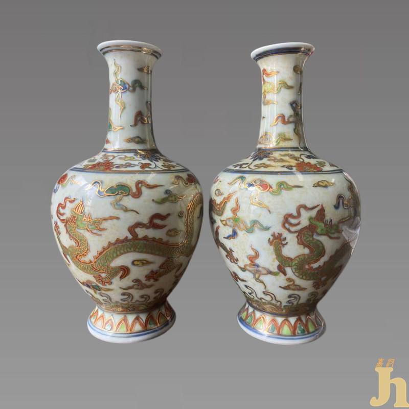 此五彩描金龙纹赏瓶,器底有“大明成化年制”两行六字青花楷书款,撇口,束颈,圆腹,圈足。瓶内外施白釉,纯净莹润。器物胎质细腻坚致,造型挺拔俊逸,颈部轮廓秀美,腹部浑圆。口沿及颈部、腹部绘制祥云纹饰,寓意洪福齐天。器身绘制两条五爪龙纹。龙纹属帝王专用纹饰,双龙头部饱满,瞠目张颔,须髯飘动。龙身修长遒劲,呈现曲线之美,腾跃而出,周身环绕祥云纹,威猛而雄奇。躯体上的龙鳞大小均匀,刻划细腻,威风凛然。整体器物纹饰繁缛,层次分明,协调的色彩与精美的纹饰浑然一体。器身两条五爪龙纹及祥云纹饰皆带有描金工艺,金彩保存完好,色彩艳丽,富丽华贵,保存完整至今,非常难得,具有很高的收藏价值和文化艺术欣赏价值!