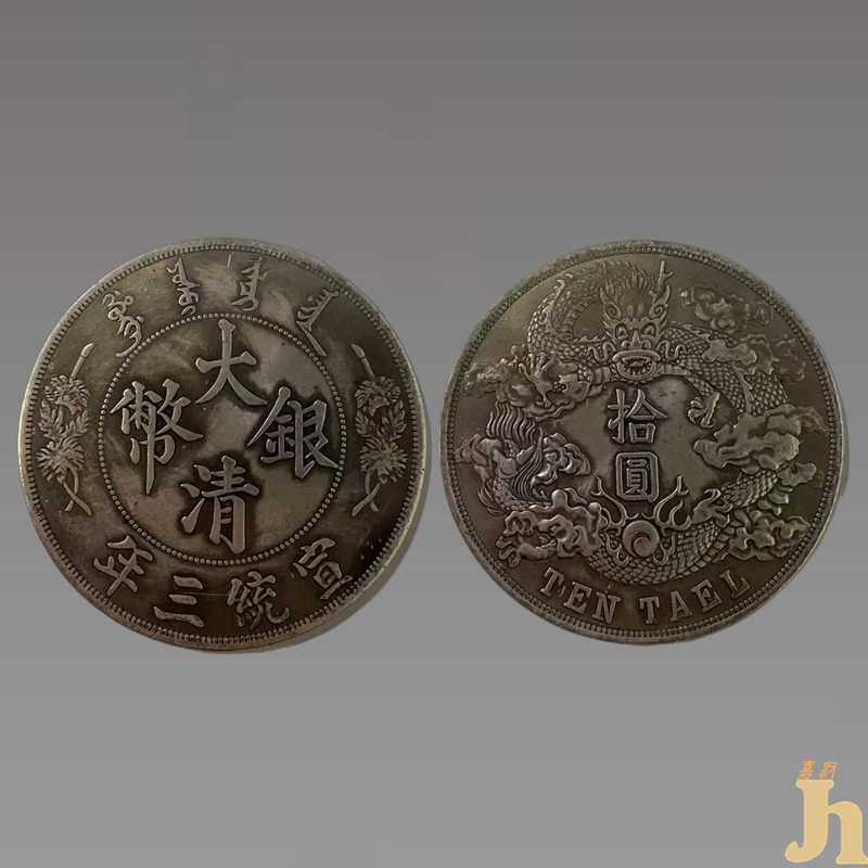 宣统三年大清银币,铸于宣统三年(1911),户部造币总厂制造。该厂设于天津,生产宣统三年大清银币有多种式样,其中进入流通领域的大清银币只有曲须龙一种。曲须龙背面英文后有一点的,俗称“有点宣三”,英文后无点者为“无点宣三”。