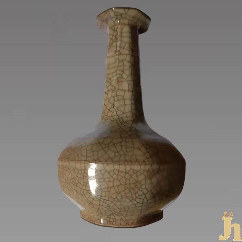 此哥窑六棱长颈瓶器底有“大宋御哥”四字篆体款。釉色以灰黄为主,做工精细,撇口,长颈,圆腹,圈足,釉色沉厚细腻,光泽莹润,如同凝脂;里外披釉,均匀光洁,密麻而又均匀分布的自然裂纹——开片。不仅瓷音清亮,而且造型挺拔大方,轮廓亦柔和流畅。凝腻的釉面间密匝或疏落的冰裂状网纹,其网纹之色浅黄者宛若金丝,细黑者如铁线,二者互相交织,因而被名之为 “ 金丝 ” “ 铁线 ”。线路稍粗色深,线段长而相互连接,线路细并弯弯曲曲,线路短。似乎形成各自不同的两张网,烧制工艺考究。具有很高的收藏价值和文化艺术欣赏价值!