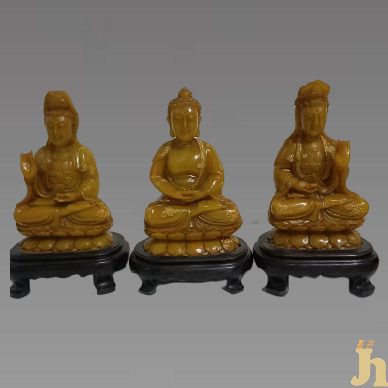 田黄雕刻三圣佛做工精细,开脸漂亮,精细做工,摆放大气。主尊阿弥陀佛结跏端坐于中央,头饰螺发,顶显高肉髻,大耳垂肩,面形丰满圆润,眉如弯弓,双目俯视,神态沉静内省,头后饰尖圆形头光,头光上刻画细密的火焰纹,工艺精巧。上身修长,身着袒右肩袈裟和僧裙,衣纹自然流畅,有唐代薄衣贴体之遗风。左手结施与印,表示能满足众生一切愿望,右手结施无畏印,表示能解除众生恐惧。身下为高束腰莲花座,上部饰仰莲三重,莲瓣错落有致,下部有覆莲一重,排列规整。主尊左侧为观音菩萨,左手当胸持莲花,右手下垂结施与印,右侧为大势至菩萨,左手下垂结施与印,右手当胸持莲花。二菩萨皆头戴宝冠,发髻高耸,面相安详,头后亦配有尖圆形火焰纹头光。身体修长,上身袒露,胸前佩饰璎珞,左肩斜披络腋,下身着长裙,衣纹呈U字形分布,如水波般优美自然,腰间束带,并露出蝴蝶结。双肩搭有帔帛,帔帛蛇形垂落,飘逸自然。侧身恭立于莲花座上,莲座形制与主尊相似。田黄是寿山石系中的瑰宝,素有“万石中之王”尊号。其色泽温润可爱,肌理细密,自明清以来就被印人视为“印石之王”。数百年来田黄石极受藏家至爱,正如俗语所说:“黄金易得,田黄难求”。早在一千多年前,中国已有人开始采集,到了明清两代田黄石更是盛名于世。许多达官显贵,文人雅士竞相刻意收集田黄石。相传清初时期皇帝祭天,神案上都少不了一方上品田黄石。因此,田黄石一直盛名不衰,身价倍增,曾有古话“一两田黄一两金”。具有很高的收藏价值和文化艺术欣赏价值!