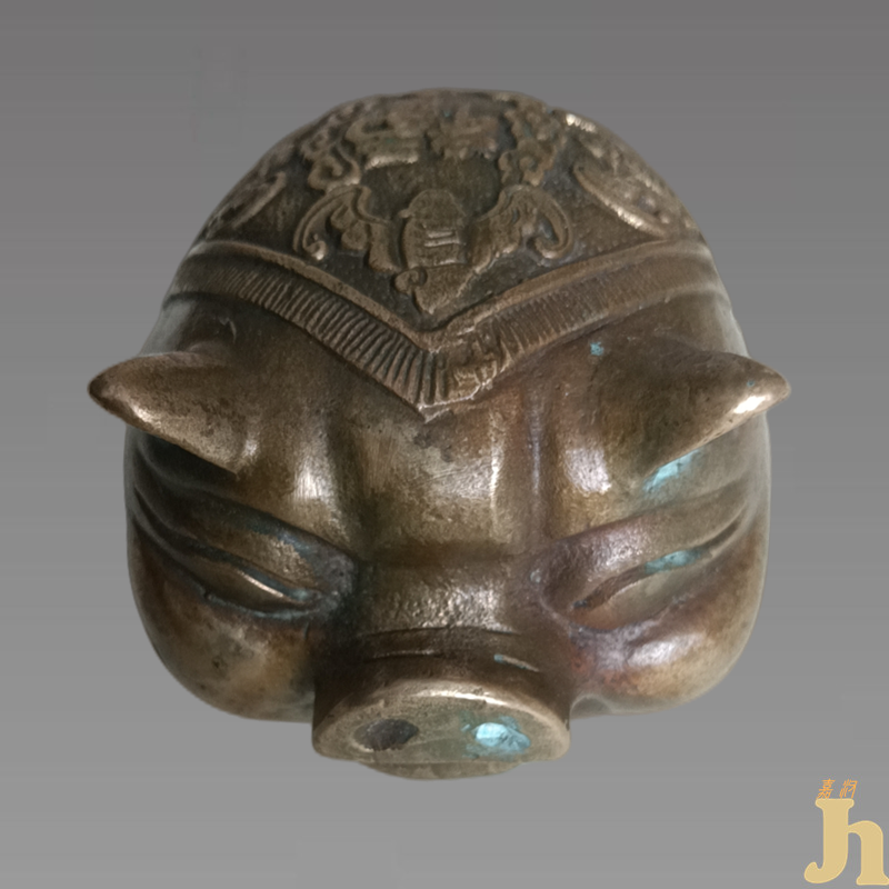 此藏品底部有“大明宣德”四字两行楷书款。此铜猪摆件,大气雅致,古朴的神兽风格,栩栩如生、炯炯有神。在雕琢上,借题发挥和顺势而为的独特手法,让摆件不沉于俗派。此藏品背顶五福,侧腹刻有“招财进宝”四字。经过历史岁月的浸染,用最原始的审美意识去看,绽放的不仅仅是吉祥之意,而且有镇宅避凶之能。蝙蝠的象征“福”。在我国传统文化里面,“蝙蝠”谐音“遍福”,象征幸福如意绵延无边。人们通过自身美好的想象,将骗蝠幻化成富有吉祥寓意的灵物,并融入生活的每一个细节里面。在过去的砖雕、石刻、木雕、剪纸、刺绣等民间工艺中,它们的吉祥身姿几乎处处可见。蝙蝠的蝠与“福”同音,所以被古人视为“福”的象征,蝙蝠飞临则寓意“进福”,寓意幸福吉祥。而现在春联、福字上画上蝙蝠,也是有此寓意,蝠到,福到。不仅如此,爱美的古代女子,还将蝙蝠做成发簪首饰的装点,戴在头上,表达对福气的向往……具有很高的收藏价值和文化艺术欣赏价值!