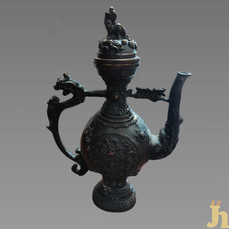 此执壶器底有“大清乾隆年制”六字三行楷书款。执壶的流、柄很别致,纹饰精美。壶身以龙形为饰,龙鳞清晰可见,龙眼庄严肃穆,栩栩如生。壶盖上的瑞兽仰天长啸,虎虎生威。执壶的流与壶身的衔接处以龙为介质,体现了皇家不容挑衅的威严。铜质精良、精细,在暗淡处能发现奇异的光泽,使该器更具皇家气概而显得无与伦比!十分少见。这种流畅、稳重而饱满的结构和古朴的纹饰极其精美,具有很高的收藏价值和文化艺术欣赏价值!