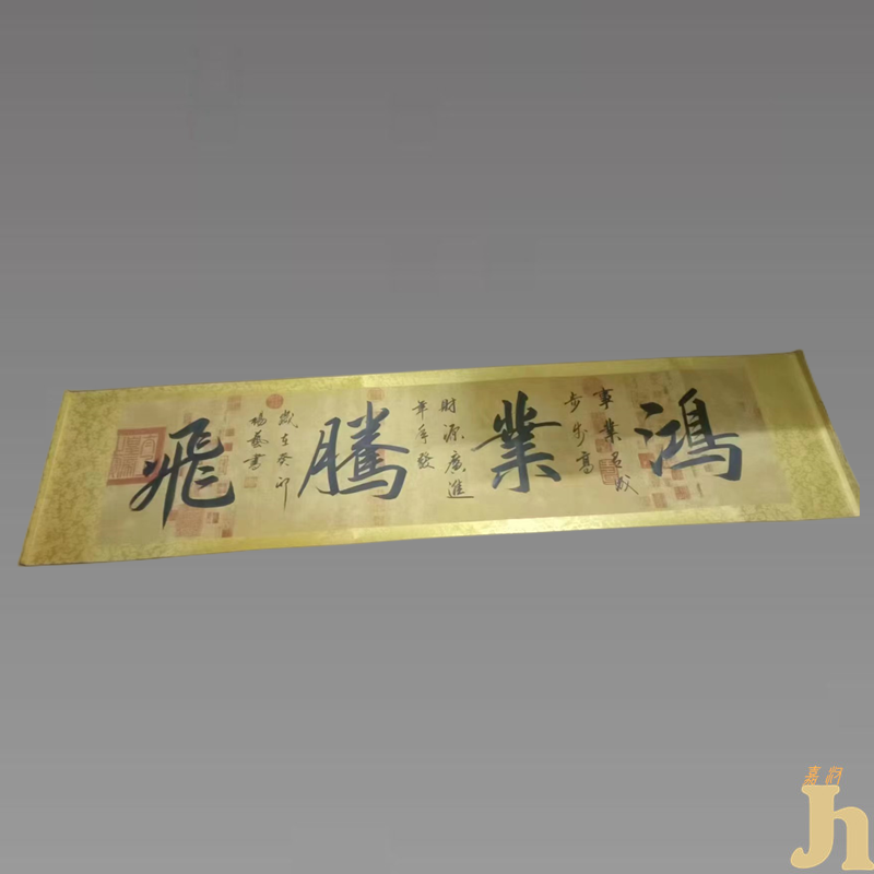 这幅书法作品的创作行云流水,采用上面四个大字,每个字中间进行祝福语及落款的章法布局,虽然传统,但是具有一定的朝气,特别是鸿字,苍劲有力中具有一定的柔性思想在其中,腾飞二字现代笔法中透露出一种古朴的感觉,整个章法布局恰到好处,无拘泥。鸿业腾飞是宏大的事业迅速地崛起,快速地发展的意思。“鸿”:大;“鸿业”:宏复大的事业。“腾飞”是一个词语,意思是急速地升腾、飞翔;还有迅速崛起和发展,比喻飞跃进步等。现如今,经商场制所、新店开业常常悬挂此幅书法,寓意生意开业大吉,步步高升,腾飞崛起,快速发展等。具有很高的收藏价值和文化艺术欣赏价值!