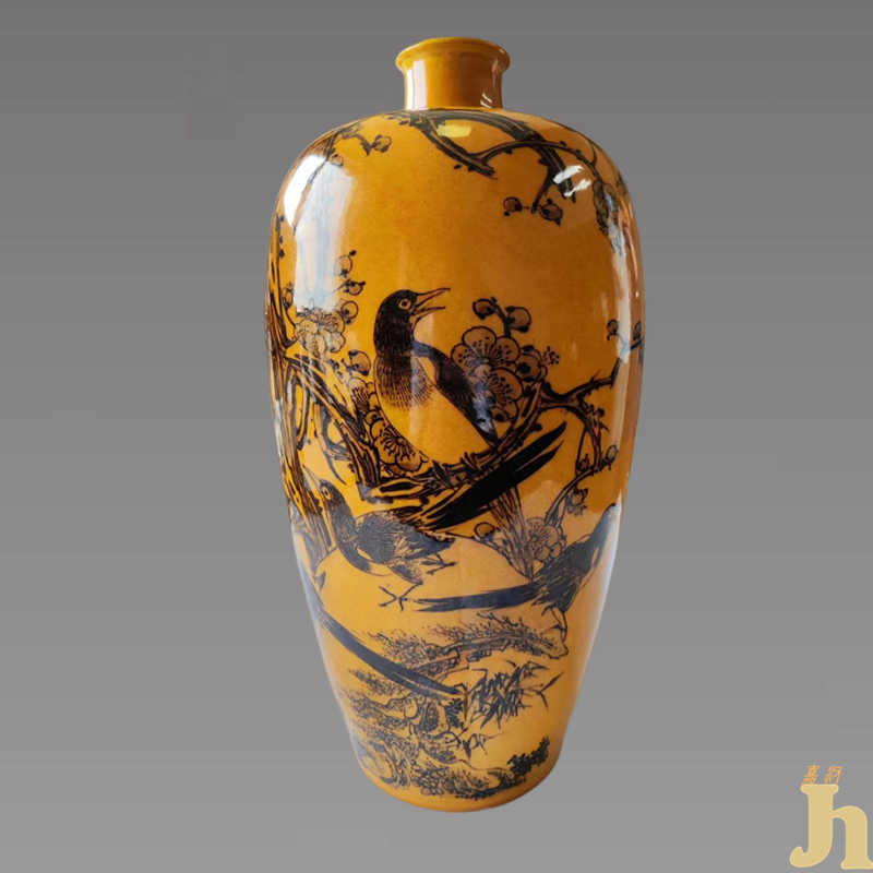 此鸡油黄花鸟纹赏瓶,器底有“大清康熙年制”六字两行楷书款。瓶小口,平肩,身较长,圈足 。一花一鸟一世界,一点一墨一神韵。花叶鸟兽的一颦一动,都是大自然灵动的诉说,这种繁花锦簇鸟飞勤的生机,是心旷情境的美好。花鸟纹饰的形象灵秀多变,常被人们用来传达美好的寓意。花鸟纹饰的出现给许多事物都增添了吉祥、美好的附加意义,以此博得了人们的青睐和追捧,盛极一时,频繁的出现在建筑、服饰、陶瓷等各种领域。黄釉是皇家控制最严格的一种釉色,清代规定里外黄釉为皇贵妃用,黄地绿龙为贵妃用,以下嫔妃、贵人则不许用黄釉瓷器,只准用绿釉紫龙器和绿釉红龙器。金黄是至尊之色,“黄”与“皇”同音,明清两代黄釉只有皇家才能使用。具有很高的收藏价值和文化艺术欣赏价值!
