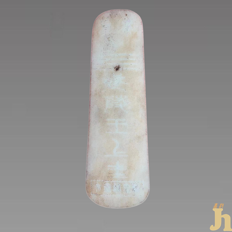 此玉圭表面抛光,全器略呈长方形,器身上半部有孔,下端饰有阴线弦纹,纹饰系用利石刻成,有明显的刻划痕迹。玉圭成为朝廷祭祀的一种礼器,后来又成为一种权利的象征。朝廷在分封诸侯时,常常赐以玉圭,作为统治地方的权杖。获得玉圭的诸侯在封地内掌握有生杀大权。具有很高的收藏价值和文化艺术欣赏价值!