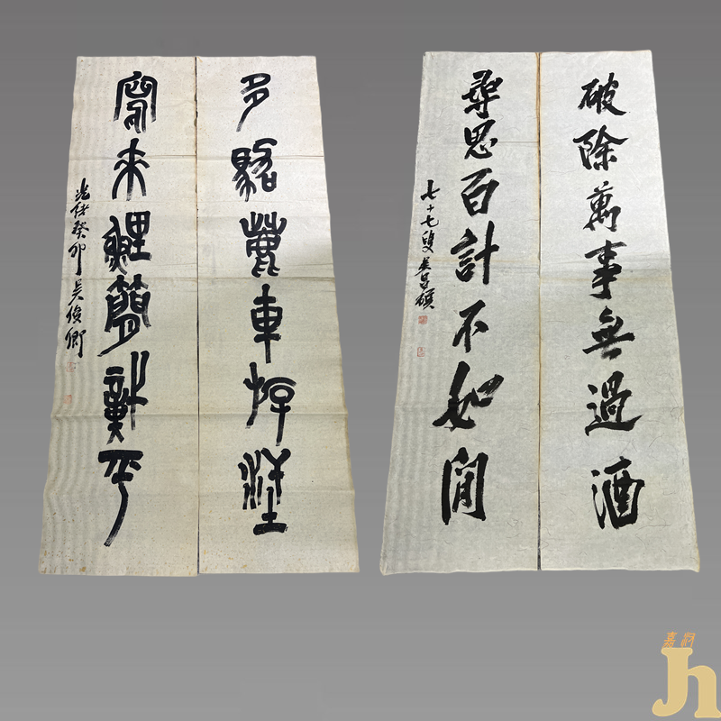 吴昌硕笔法雄浑苍劲、篆书重严而不滞,虚宕而不弱,甚至可以说已经是登峰造极。其书风特点是结体工整严谨,圆中带方,方中有圆,婉转流畅,藏头护尾。风格古茂雄秀,圆融混劲。此书法上面的字,字字犹如巍巍高山之屹立,端庄厚重之中充溢着一种铿锵作响的金石气息。雄强的笔画,安详的结构,整幅楹联一气呵成,不同凡响。诚属罕见,所谓老笔纷披,生辣古朴,超逸疏宕,具有很高的收藏价值和文化艺术欣赏价值!