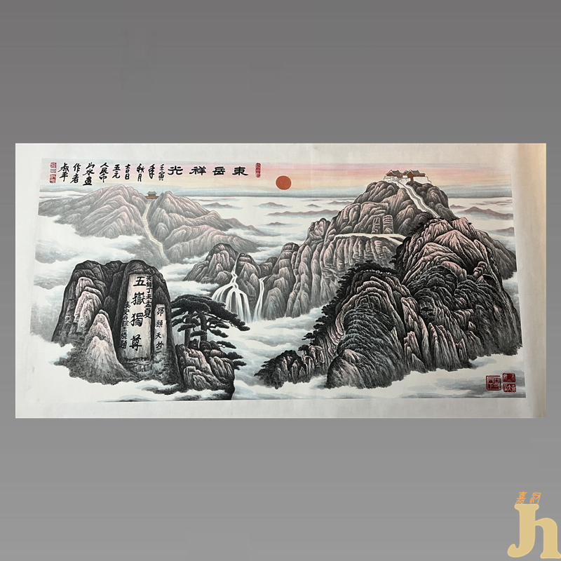 这幅作品用“蒙太奇”的思维来绘制各场景中的衔接关系、用移动的手法表现人世间的最美画卷,他追求整体美、平衡美,有时没山、没悬崖的地方为追求艺术美,从这个山的其他地方移动一个山、一个悬崖绘制而成,泰山一何高,迢迢造天庭。泰山,作为五岳之首,有“天下第一山”之美誉。它数千年的精神文化渗透及人文景观烘托,自然逃不过李叔平的眼。他的泰山山水画文化底蕴扎实,传统功力深厚,大气磅礴,粗狂朴拙,笔墨淋漓尽致,皴法独树一帜,构图宏大致远,富有诗情律韵,雅俗共赏,被誉为"浩然大气真山水,圣山神韵大泰山"。俯视角度奇景,构图大气,墨色清新,绘泰山群峰起伏,云海穿插其间,石阶古寺若隐若现,整幅佳作追求势、气、韵、意贯融,有靠山可依,事业稳固,富有深意,值得细细品味。这幅李叔平老师的泰山题材山水画,工写兼备,层次感强,山之大气,松之茂盛,旭日之蓬勃,皆宛在眼前,环绕在山间的云雾,缥缈朦胧,似动非动,更加衬托出泰山的壮观,通往古寺的台阶还有步步高升的内涵。整幅佳作不论从画面还是用色上都别具一格,皴染浓浓泰山情,为观赏者带来美妙的视觉享受。具有很高的收藏价值和文化艺术欣赏价值!