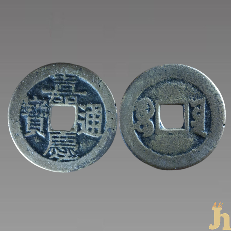 嘉庆通宝铸于清仁宗嘉庆年间(1796-1820年)。面文用宋体,背文为满文局名。