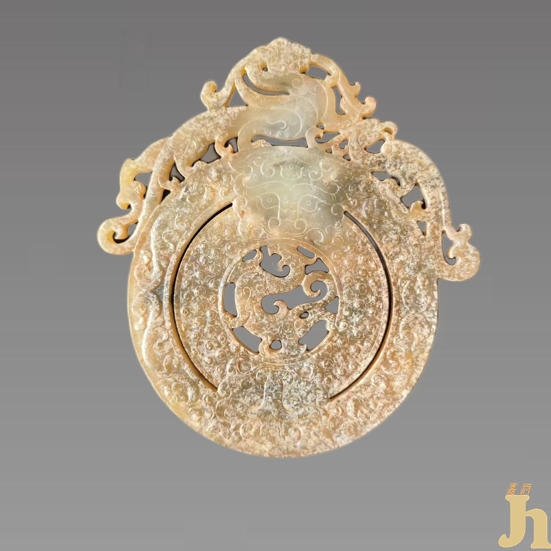玉璧双面饰以浮雕谷纹,浑然天成,纹饰饱满,中孔、外源圆滑平整。璧上方出廓双面对称透雕跨步前行螭龙,造型生动,躯体翻卷有致,雕琢精致,线条流畅,中心镂空雕刻着螭龙,头部如虎首,圆眼睛大鼻子,猫耳,卷云纹一般的尾巴。具有很高的收藏价值和文化艺术欣赏价值!