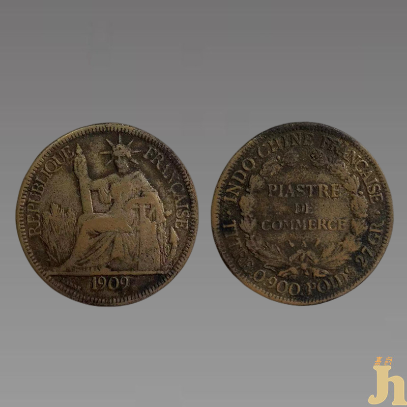 该钱币为1909年版坐洋币,图案精美,内涵深邃。藏品正面所铸自由女神坐像头上戴有七束光芒的花环,手执束棒,坐像的两侧铸法文文字是:REPUBLIQUE FRANCAISE(法兰西共和国)。女神座下方有小字法文BARRE和该币发行的年份。钱币背面的主图案为一花环,周圈为说明文字,花环上方铸法文为:FRANCAISE INDO-CHINE(法兰西印度支那),钱币花环中间的横向文字为银币的面额:PIASTRE DE COMMERCE(皮阿斯特的贸易银)。花环下方文字为:TITRE 0.900 POIDS 27 GR。该版钱币发行流通于殖民地,属于较为珍贵稀少的品种,具有很高的收藏价值和文化艺术欣赏价值!