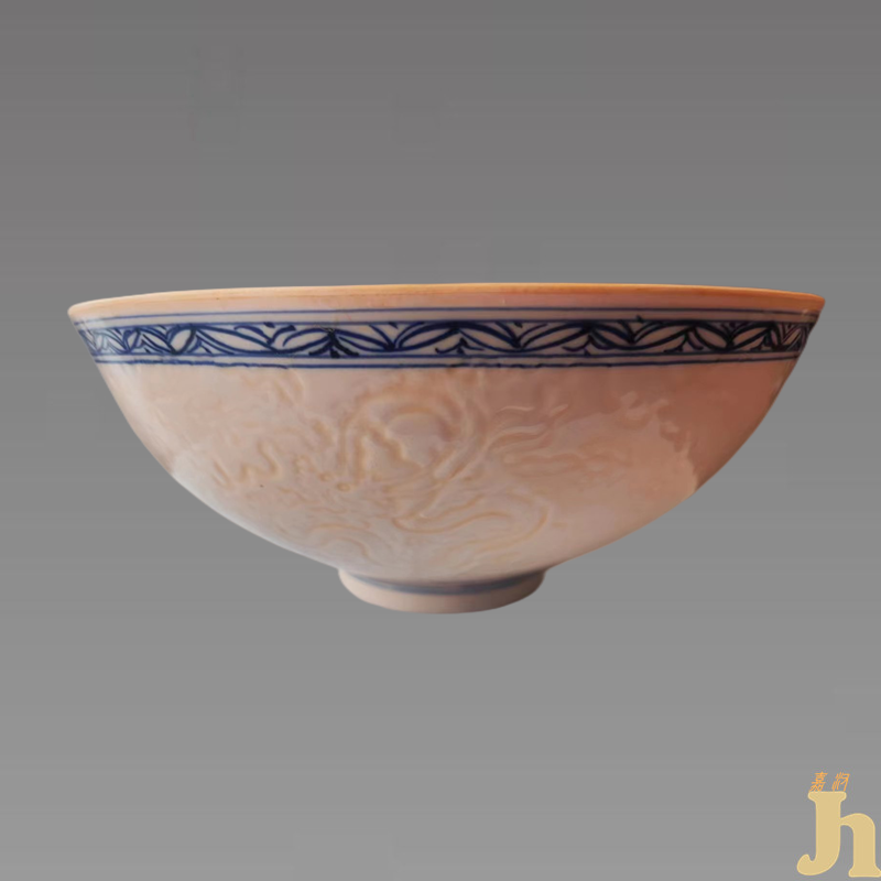此碗器底有“大明成化年制”六字青花楷书横款。碗口外撇,弧壁,深腹,圆足,釉自然流淌,形成一条整齐如丝的白色条,俗称灯边草,外壁暗刻云龙纹,张牙舞爪,十分威猛。不细查不见其有,圈足外因釉的下流,形成一周原釉层,几与胎骨厚度相等,但恰到好处,胎骨细而白净,灯光下呈现肉红色,龙纹乃当时皇室贵族所用,做工精美,难能可贵,在汉族等一些民族的传统文化里,常用来象征祥瑞,是四圣兽之一,根本不同于西方的恶魔Dragon,有的传教士把龙翻译为Dragon,导致中华形象在欧美的恶魔化,欧美华人创立新词Loong来翻译汉语的龙,维护中华的主要象征符号。具有很高的收藏价值和文化艺术欣赏价值!