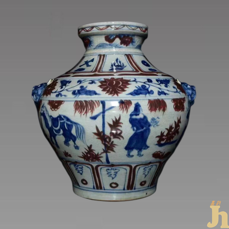 元青花釉里红双兽耳人物大罐