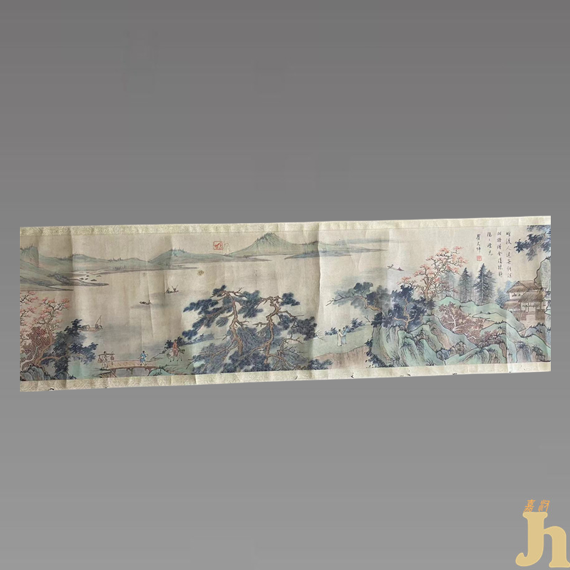 阵阵东风吹来了细雨,宽阔的水面泛起微微的涟漪,一丛丛芦苇在水中来回摇曳,河面上几艘渔船,有人乘船过河,河边有人垂钓,桥上有人挑着扁担,有人骑着高头大马,另外一边两位文人指着挺拔的松树对话,岸边有几间简陋的茅草屋被草从所遮掩,数棵婀娜多姿的柳树垂下千条万枝,坚韧无比的松树屹立在岸边,远处高山一座接连一座,苍苍茫茫的云雾流连山间......画家取素绢为材,以小青绿法出之,近赵伯驹、伯骕一路,设色鲜丽润泽,俊秀蕴藉,一片山色青青,郁郁葱葱。点景描划细致,或幽篁诵读,或登楼观澜,或桃园闲坐,俱远离尘嚣,恬澹虚静,尽文人筑园幽居之闲适情怀。具有很高的收藏价值和文化艺术欣赏价值!