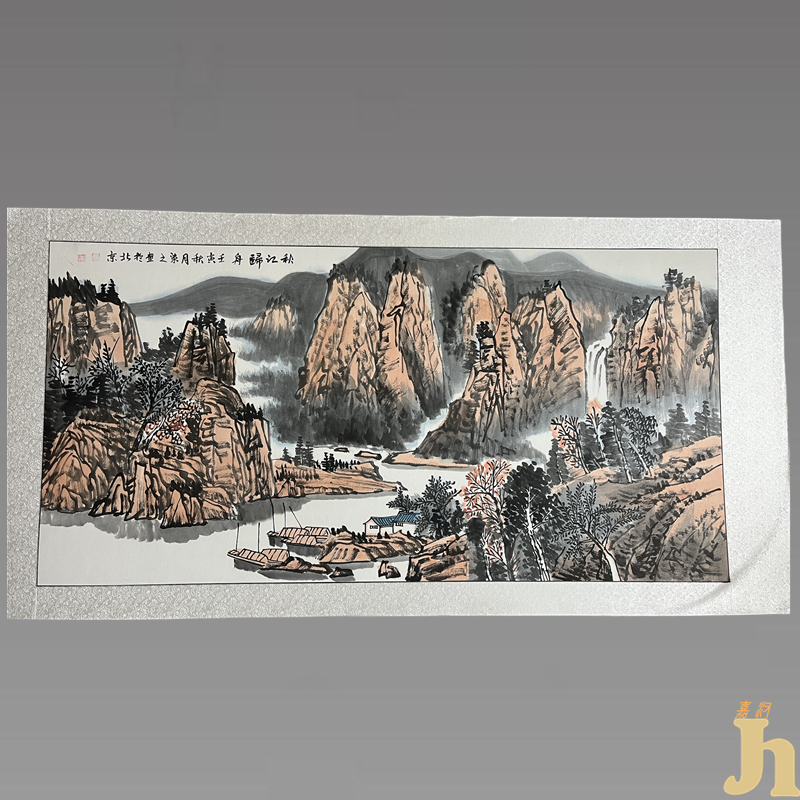 此幅方染之的“秋江归舟”图,其中山川、河流、林间小屋、小船等绘画清晰细致。近处山体高大巍峨,气势恢宏,远处山峦重重叠嶂,连绵不绝,云雾显晦,犹如置身于仙境。曲折婉转的江流流淌于高耸的山林间,江面平整如镜面,清澈的江面倒映出高山的画面。此图中下方水上沙洲处坐落一院白墙蓝瓦人家,外加停泊在江面上的五只渔船,为整幅图画增添了一丝人气。无论为了单纯的乡关之情,还是向往精神的归宿,舟都载着通往“吾庐”的希望。借扁舟,表达的是理想的期待,对精神家园的寻找,对生命止泊境界的向往。远处一川瀑布,集流于两山半山腰之间,一泻而下。几颗树木上的黄叶,淋漓尽致的体现了“秋”的特点。此作品笔墨浓淡适宜,线条苍遒沉敛,整体布局疏密有致,“境由心造,怀柔山水”,不失磅礴之气,布局雄浑,中天峻朗。具有很高的收藏价值和文化艺术欣赏价值!