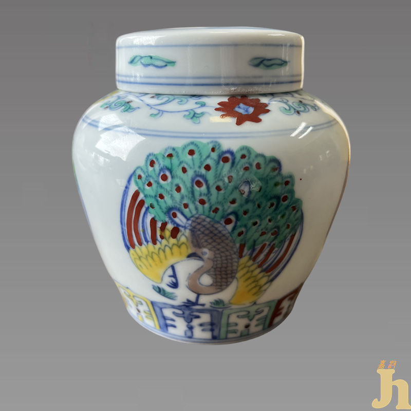 此藏品罐直口,短颈,肩圆,腹收敛,大底,外底署青花楷体“天”字款。通体斗彩装饰,肩绘莲瓣纹,罐身已黄、绿、红、褐、蓝绘制开屏孔雀,画意生动,疏密相宜。“天”在梵语中称“提婆”,与天上、天有、天趣、天道、天界等同义,系“十界”之一,构成佛教密宗法义。“天”字款显示了瓷器做工质量、使用对象等多方面的至高、第一、尊崇,彰显社会对皇权的崇拜。具有很高的收藏价值和文化艺术欣赏价值!