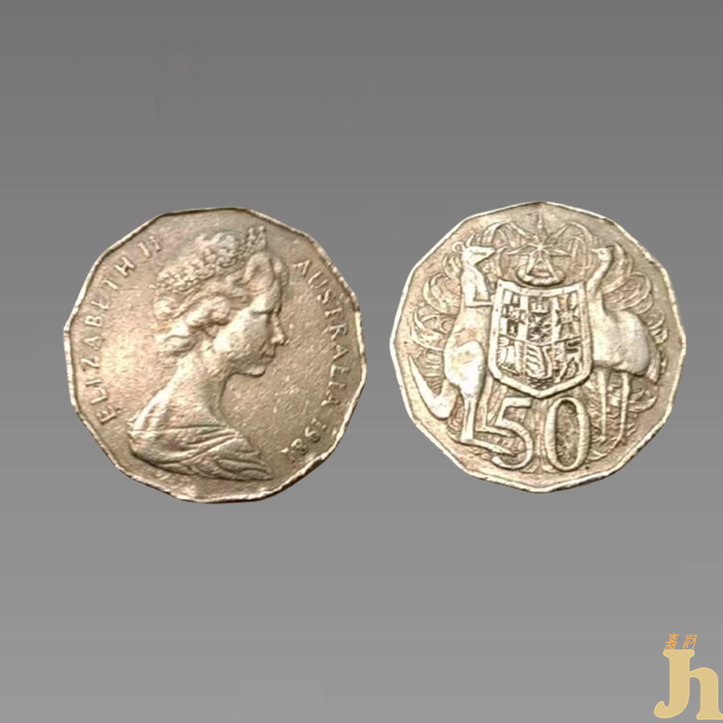 澳大利亚五十分硬币是所有硬币中形状最大、份量最重的。它的背面的图案是澳大利亚的国徽,中心是一块盾牌,上面刻制了六个州的徽章,表明六个州联合组建成了澳大利亚联邦。一只袋鼠和一只鸸鹋共同护卫着这块盾牌。背景是澳大利亚的国花金合欢。澳洲特有的袋鼠已经成为澳大利亚不言自明的象征,鸸鹋这种高大善奔跑但却不会飞的鸟也是澳大利亚特有的动物之一。五十分硬币是澳大利亚所有流通使用的硬币中唯一的一种多边形的硬币,其它的硬币都是圆形。具有较高的收藏价值和文化艺术欣赏价值!