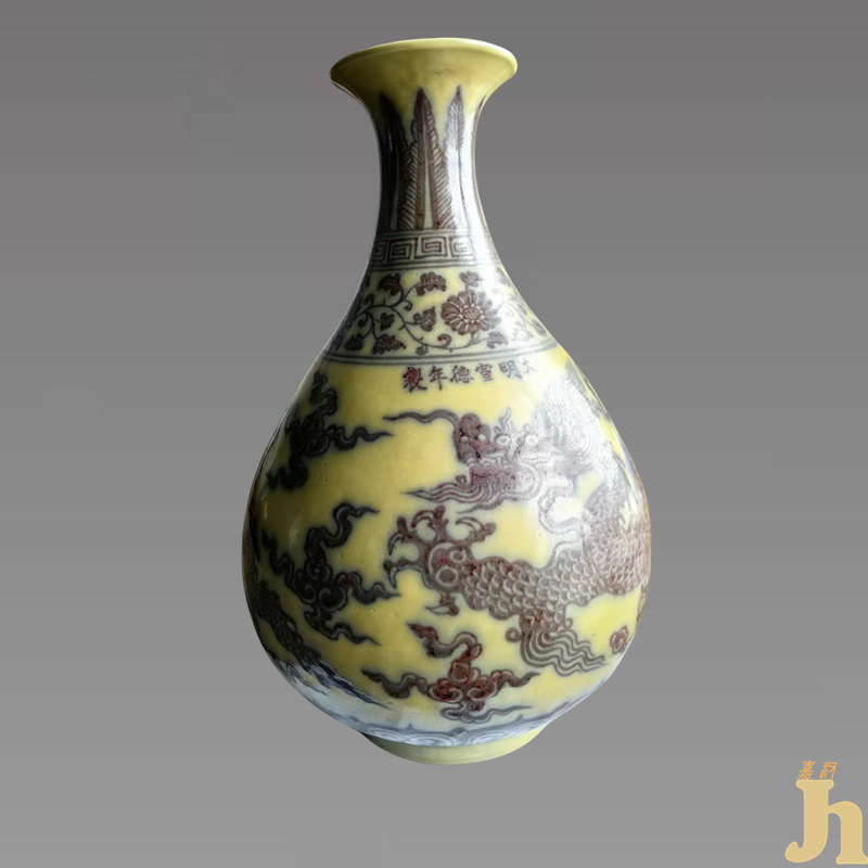 此釉里红玉壶春瓶肩颈处有“大明宣德年制”六字楷书横款。黄釉打底,通体绘铜红釉云龙纹,足内露胎无釉,造型典雅端庄规整,器型粗大,撇口、细颈、垂腹、圈足。肩颈处为缠枝花卉纹,腹部云龙纹栩栩如生,龙体浑圆、雄健有力,龙嘴上翘,龙须上翻,龙体变粗;肘毛的处理细腻,鳞片饱满,刻划细腻;抚摸温润如玉。丰富自然。内部历史侵蚀痕迹丰富,釉里红晕散自然。具有较高的收藏价值和文化艺术欣赏价值!