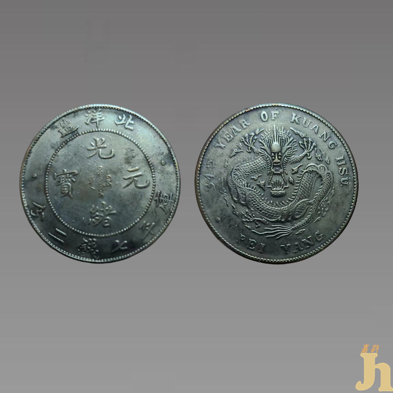 北洋造光绪元宝是当时的造币质量最高,也是最早的一批光绪元宝。之后才有的各大省份的元宝出现。清朝末年,当时朝野上下发生了银元单位之争,币制未统一。北洋机器局更名北洋造币局,铸行较早脱离“两单位”的银币后,又于光绪二十五年始,铸行面值库平纪重的“光绪元宝”,在这类币的背面左侧阿拉伯数字表示该币为光绪X年版,常见有25、26、29、33、34等数种,流通全国。此币背面是34表明此币是光绪34年造,北洋造光绪元宝发行量少,市场稀缺,如今存世的更少,近年来收藏钱币市场火热,