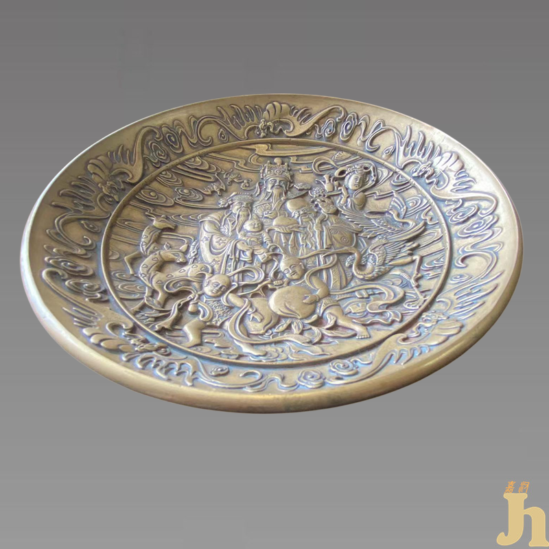 此盘中财神爷位于正中央,寿星公“手捧仙桃”,长头大耳短身躯。留着白眉白须,持杖,额部隆起,含笑而立。那和蔼的微笑,使人自然而然地想到仙人开朗乐观的性格,给人以可亲可敬之感。仙鹤在古代是“一鸟之下,万鸟之上”,仅次于凤凰的“一品鸟”,明清一品官吏的官服编织的图案就是“仙鹤”。同时鹤因为仙风道骨,为羽族之长,自古被称为「一品鸟」,寓意第一。一品是古代最高官阶的名称,皇帝以下文武百官共分九级,一品最高。仙鹤也是鸟类中最高贵的一种鸟,代表长寿、富贵。传说它享有几千年的寿命. 仙鹤独立,翘首远望,姿态优美,色彩不艳不娇,高雅大方。此“宣德年制”四仙蝠纹盘集齐了财、寿、福、禄的题材,具有较高的收藏价值和文化艺术欣赏价值!