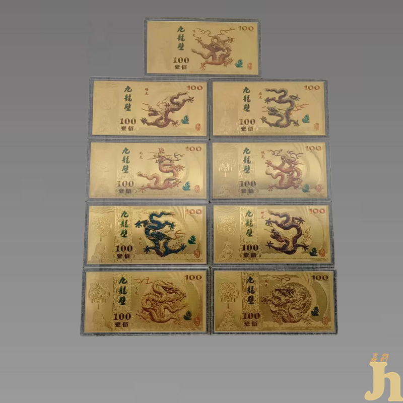 九龙是指蛟龙、应龙、螭龙、蜻龙、鸣龙、蜥龙、火龙、蟠龙、虬龙 。龙象征着一种精神,是一个民族的图腾。意义非凡,可以说是个民族的统称,地域的统称,拥有经久不息的传承意识夹杂其中, 龙在中国传统文化中是权势、高贵、尊荣的象征,又是幸运与成功的标志。 龙钞的材质采用了金箔,成为我国流通纪念钞发行史上的首创。具有较高的收藏价值和文化艺术欣赏价值!