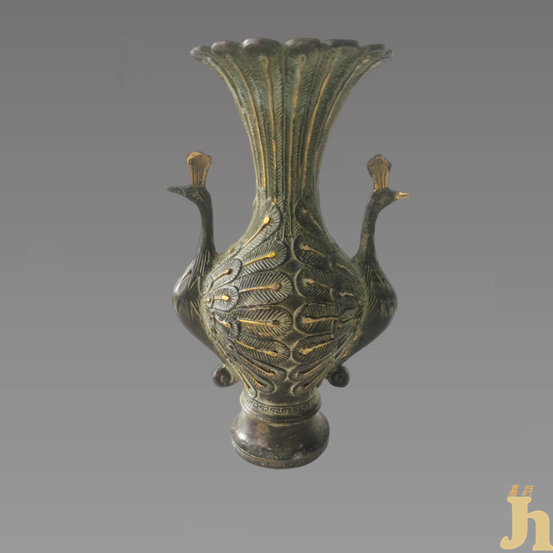 此古朴奇特的“孔雀瓶”,其孔雀头部各居瓶身两侧,从孔雀颈部至身巧妙地作成瓶身,而孔雀屏则向上展至瓶颈,欲开未展,呼之欲出,富有动感;外观颜色以青铜为主色调,极具凝重、古朴的艺术效果,充满古青铜器的厚重神韵。这件孔雀铜瓶工艺堪称巧夺天工。以两只合为瓶状的开屏孔雀造型为基础构架,采用概括图案化的造型风格打造而成,孔雀整体收拢成开屏状瓶形,有“团圆、吉祥”的寓意。瓶口外沿的翎毛,简明概括之处理手法借鉴于中国写意花鸟,具有独特的装饰效果。孔雀的头颈和腹部成为瓶身和耳配,比例和谐,线条流畅,器型大气,构思巧妙。整件器形生动自然,寓意深刻。 具有较高的收藏价值和文化艺术欣赏价值!
