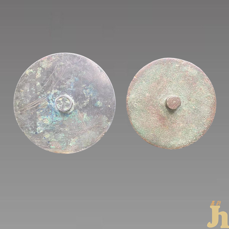 护心镜是古代镶嵌在战衣胸背部位用以防箭的铜镜。一般位于胸口正中此组铜镜,一大一小,镜身呈圆形,中间稍厚,镜面微凸。镜背光素无纹,中心有一圆形纽, 制作工艺非常繁琐,需要经过多道繁琐的工序才能完成。制作的铜镜需要先进行铜合金的冶炼,然后将其铸造成镜子。可以更好地表达人们的思想和情感。它们可以更好地传达宗教、哲学或文化意义,因此在古代文化中扮演着重要的角色。青铜镜表面青色锈迹,但隐隐可看见无锈迹的地方有微亮的反光。款式相对简单大方,未施纹饰。具有较高的收藏价值和文化艺术欣赏价值!