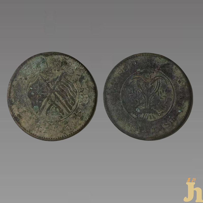 民国成立后,铜元仍继续大量流通使用。1914年,铜元正式改称“铜币”,民国发行的铜币与清最大的区别是龙纹被换成了由稻穗组成的嘉禾纹。各省铸造的铜元大多为两面叉的国旗图案,并有“开国纪念币”或“中华民国铜币”字样。