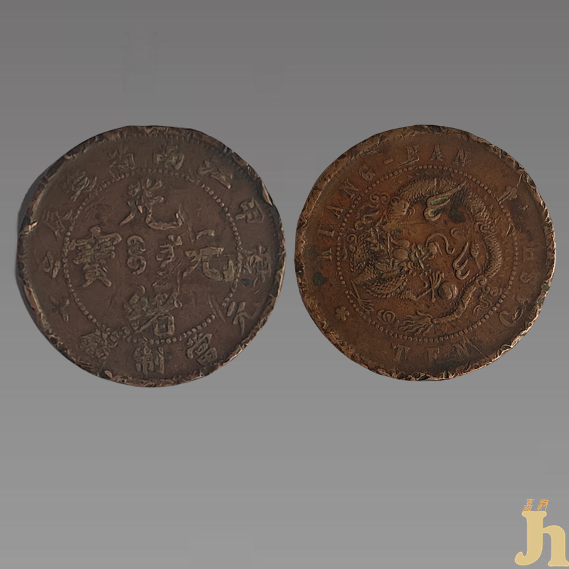 此光绪元宝江南省造甲辰每元当制钱十文 :正面中间是“光绪元宝”中心有两个满文,上方铭文为“江南省造”,下方为“每元当制钱十文”,在“江南省造”的两边,右“甲”左“辰”是记年。中间的珠圈由99个小点组成。背面,中间是短七尾斜眼龙,上方为英文,左右各一个玫瑰花饰,中间的珠圈由小点组成。此枚光绪元宝江南省造甲辰每元当制钱十文下方缘英文面值,品相佳,包浆明显。此枚钱币最特别之处在于——背面的龙纹图案由于机压错误,错位45度。是十分罕见珍贵的错版币!具有较高的收藏价值和文化艺术欣赏价值!