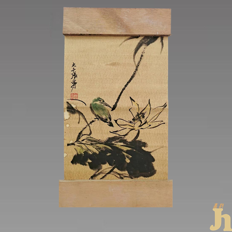 张大千所绘花鸟技法上勾勒、写意兼而有之。在行笔节奉和墨色处理上多添新意,并运用自如。他笔下之木本花卉的枝干柔中蕴刚,用墨华滋多变,敷色清嫩鲜活,意境闲逸。在花鸟画中,张大千最擅长画荷,也最见成就。大千画荷,工笔、写意具能。"画作在用笔、用墨、用色、用水、布局诸方面均极佳,堪为神逸之作。以浓墨为主、干湿浓淡变化丰富的破笔画荷叶,既间以同前一荷花的抑扬有致的黄荷花,随衬以淡墨荷叶……花作若隐若现状,宛如含羞少女,娇憨可爱。在墨色方面,自近而远,由浓至淡,浓淡相间,臻于化境。在布局上,以实为虚,具有很高的收藏价值和文化艺术欣赏价值!