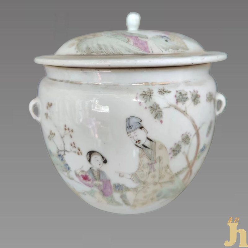 此粉彩人物图瓷粥罐这件瓷粥罐的造型非常丰满,口沿直且矮,圆肩过渡到罐体,圆腹显得很饱满,腹中部向底足处向下收敛,圈足处无釉,肩下腹上部对称,每边各有两只象鼻耳系,罐外壁一面绘瓷画,为粉彩瓷中典型的人物纹图饰,笔墨秀润,色彩淡雅。画片为通体粉彩人物,画片流畅,设色淡雅中见鲜丽,有一种文人画的意境和情趣,这类粉彩作品构图严谨明快,形象概括凝练,图案纹饰与主体画面相互衬映,达到了内容和形式的高度和谐。色彩对比强烈、鲜艳,在造型、线条、色彩、光线等方面,均吸收了古代绘画的营养,显得别有洞天。罐体由二件套组成,分别为盖,底下的罐。底款“陈泰祥造”,清晰可见。具有较高的收藏价值和文化艺术欣赏价值!