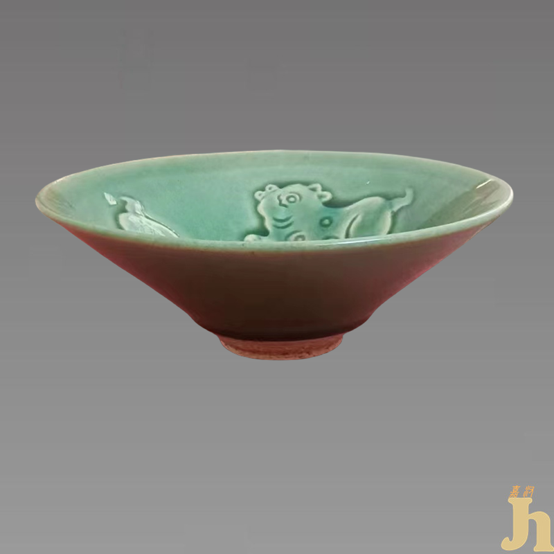 吉州窖绿釉内刻猪事顺利斗笠碗