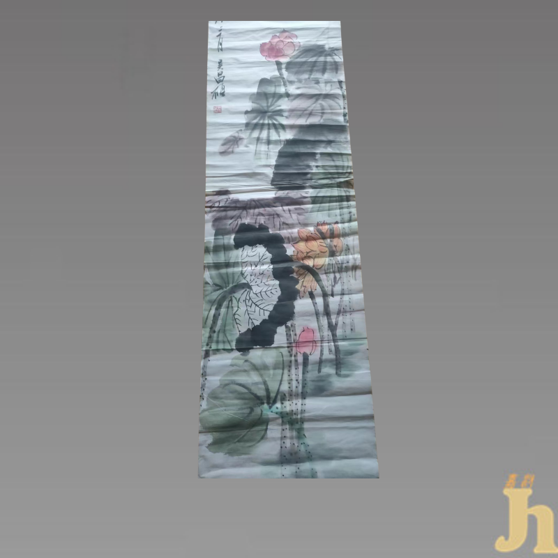 荷花寓意着高洁、高尚的品质,它从浑油的淤泥中生长出来,但是开出来的花朵纯净美丽,出淤泥而不染,濯清涟而不妖,有着自己的坚守和信仰。可以将荷花比作清正廉明的官员和高洁的君子,象征着刚正不阿.不向世俗低头。且因”荷”与”和“谐音,所以寓意着美好祥和、吉祥。此图绘荷塘小景,荷叶以泼墨法绘出,墨分五彩,浓淡相宜;荷花以胭脂加水晕染,得娇艳欲滴之貌。构图盈满,层次鲜明,画风新奇。作品重整体,尚气势,主张“奔放处不离法度,精微处照顾气魄”,富有金石气。讲求用笔、施墨、敷彩、题款、钤印等的疏密轻重,配合得宜。具有较高的收藏价值和文化艺术欣赏价值!