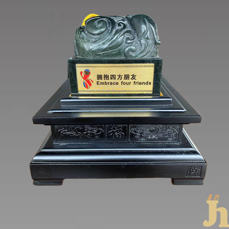 此宝玺运用了金镶玉工艺,采用纯天然和田青玉打造而成。需经玉雕大师数周呕心力血精雕细琢,同时雕刻标准要求极其严格,稍有偏差即为次品,次品立即销毁,损耗巨大。每方宝玺的纹理和重量都是独一无二的,在藏品史上前所未有,堪称奥运史上绝对的“玉器王者”《奥运徽宝》无可比拟的玉器王者身份,金玉结合,大师风范,价值非凡,集结东西方文化于一体,展现了世界人们对奥运的欢庆之心! 具有较高的收藏价值和文化艺术欣赏价值!