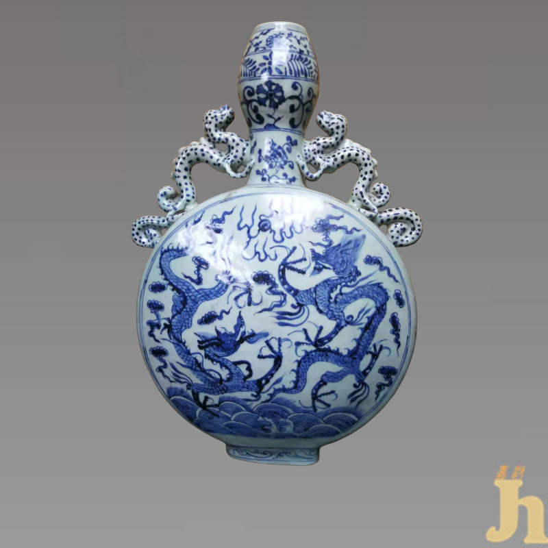 此瓶葫芦式,收口,束颈,圆形扁腹,浅圈足。中部两节葫芦间有龙纹双耳。白釉为底,纹饰空白处制轨道修饰,胎釉细润,精巧端庄。龙纹在碧涛中翻滚腾游,分外矫健。青花发色方面,钴青点染纹饰,青花之浓黑铁斑。玲珑别致。瓶身扁平,形若满月。全器以青花绘就,画面精湛,青花浓重,色泽浓艳,胎骨均匀,胎质细腻,莹润自然,让人赏心悦目。此瓶整体画面恰似一朵美丽的宝花,圆球形口,上饰一周缠枝花纹,瓶口沿书"大明宣德年制"六字楷书款。具有较高的收藏价值和文化艺术欣赏价值!
