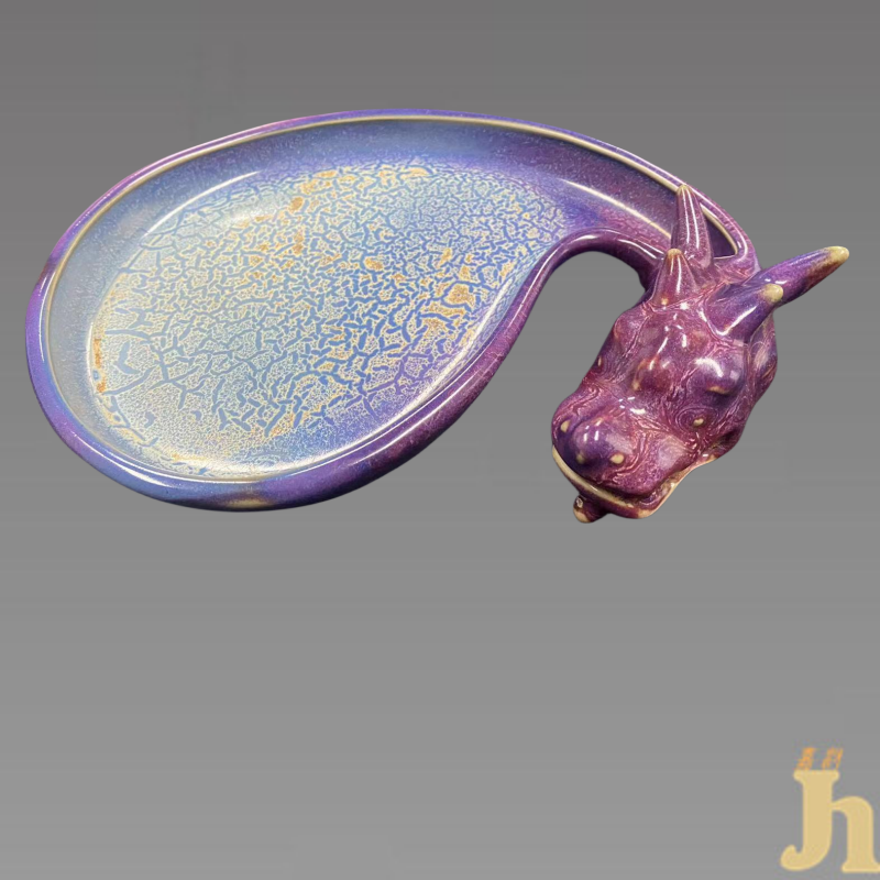 此洗胎体厚重,优雅端庄,整件器物凹凸有序,窑变自然,整体看上去雅致而温润,俗话说的好“纵有家财万贯,不如钧窑一片。”该藏品通体内外施釉,雕工漂亮,工艺精湛,形象逼真,龙头向上张望,似乎在寻觅着什么,纹饰雕琢细腻,绚丽夺目,独具匠心,且龙自古就是权势、富贵的代表,寓意节节高升、大富大贵,美好和吉祥,整体器形规整、高雅大气,轮廓秀丽匀称;其势沉重古朴,明亮而深沉;给人一种古朴、沉静的感觉。具有较高的收藏价值和文化艺术欣赏价值!