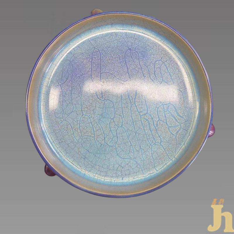 此盘内天青釉,外窑变釉,三足洗造型简洁雅致,严谨规整,釉色肥润失透,给人以清凉温润之感,胎体厚重,优雅端庄,三足显得非常大气,整件器物凹凸有序,窑变自然,整体看上去雅致而温润,俗话说的好“纵有家财万贯,不如钧窑一片。”该藏品通体内外施釉,釉色青中泛紫,绚丽夺目,独具匠心,为钧瓷中的收藏珍品,由于釉色的相互交融而产生的无数颜色不一、形状各异的窑变,是构成钧瓷区别于其它青瓷的另一个特色。钧釉中的紫色引人注目。各种紫色是红釉与蓝釉互相融合的结果。钧釉的紫斑在工艺上是将青蓝色的釉上有意涂上一层铜红釉所造成的。后人对钧瓷的紫色的评价巨高,近人刘子芬在《竹园陶说》中说“钧窑器一枚,价值万金┅┅宋时紫色如熟透之葡萄,浓丽无比,紫定、紫钧,其器皆纯色。”具有较高的收藏价值和文化艺术欣赏价值!