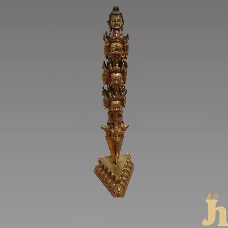 金刚降魔杵,又名普巴杵,一端为金刚杵,另一端为铁制三棱杵,中段有三佛像,一作笑状、一作怒状,一作骂状。此法器通常为修降伏法所用,用以降伏魔怨。
