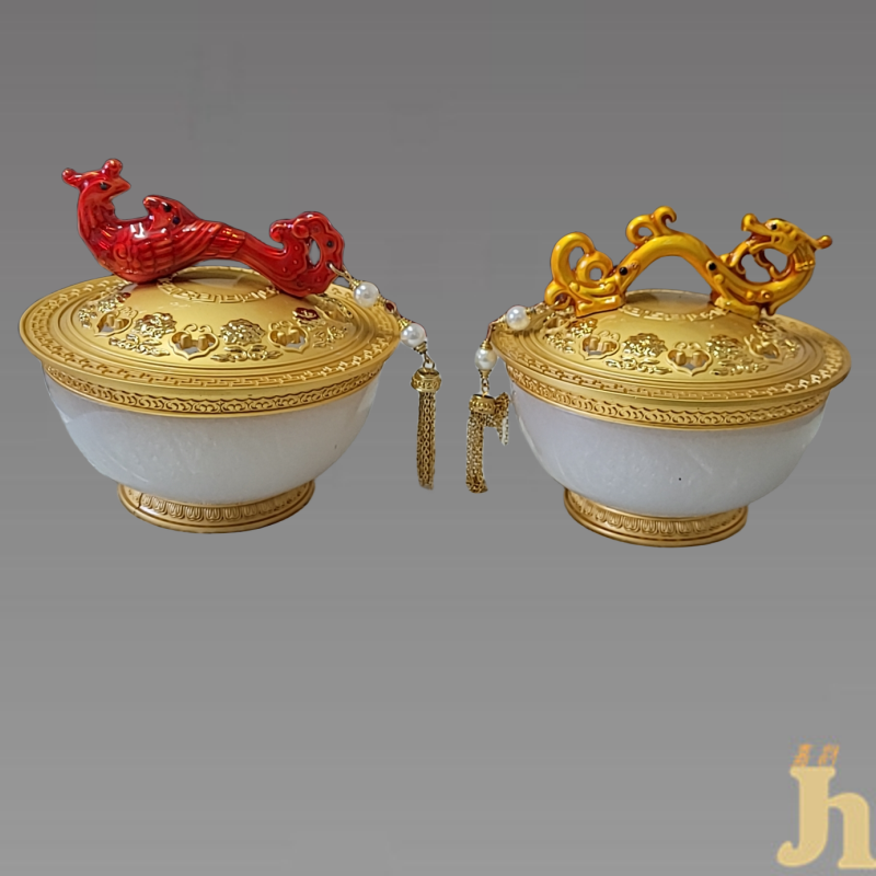 在民间,凤凰贵为“百鸟之王”,有“百鸟朝凤”的美丽传说,因此,凤凰便成为中华民族传统文化中最具代表的图腾形象之一,被赋予“吉祥、尊贵”等美好寓意。龙虽然并不是一种真实存在的动物,形象也是融合了马、狗、鱼、鸟、鹿、蛇等多种动物身体特征的一种集合体,可以为之四不像,但它在国人心中却是最倾慕的理想生灵。在中国各种的上古传说中,龙有着腾云驾雾、上天如海、呼风唤雨之能力,于是龙的寓意也就注定非凡。在古代,龙被视为四灵之首,所以人们认为人间的九五之尊也是天上的真龙下凡所化,故而帝王皆被称为真龙天子,因此龙的寓意也就和权势地位相关。当人们在身上佩戴一方龙吊坠,往往也就意味着可以手握重权、掌控八方,同时也代表着男性的刚毅。此款五彩龙凤纹对碗胎质细腻,釉质润泽,釉面匀净,器形周正,纹饰华贵,极具皇家祥瑞之吉相。碗腹腔浑圆略鼓,显包容宇内,福接天赐之相。开口广阔,寓海纳百川,胸怀广博之意。龙凤呈祥对碗,共有金、玉两种材质,采用传统金玉器工艺与现代工艺结合,精工打造,工艺绝伦,弥足珍贵,集传家、健康、实用于一体,具有较高的收藏价值和文化艺术欣赏价值!