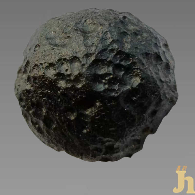 玻璃陨石多为不规则形状,此玻璃陨石为圆形,整体呈现墨黑色,油亮且有光泽,表层具拉长状气泡及大小不等的圆形气泡,有的似如月球表面的环形山状图案,熔壳在阳光下闪耀着耀眼光芒,非常珍贵。灼烧痕迹明显,气印密集漂亮,是陨石降落过程融化的液质冷却后产物,被称为天外贵客,具有较高的收藏价值和文化艺术欣赏价值!